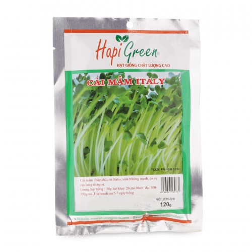 - Hạt giống cải mầm Italy Phú Nông 120g được chọn lọc kỹ lưỡng, có khả năng kháng bệnh rất cao. Đồng thời, sản phẩm có độ sạch trên 98%, giúp người dùng có thể gieo trồng dễ dàng.