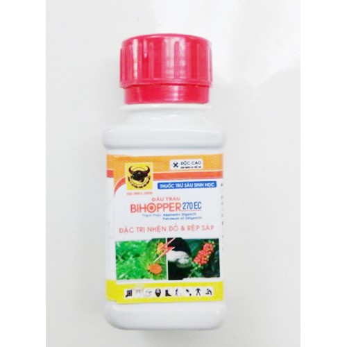 Thuốc trừ sâu sinh học Bihopper 270EC hiệu Đầu Trâu, với thành phần abamectin 20g/l và petroleum oil 250g/l, đặc trị nhện đỏ và rệp sáp, sâu ăn lá, rệp muội, bọ phấn trắng.